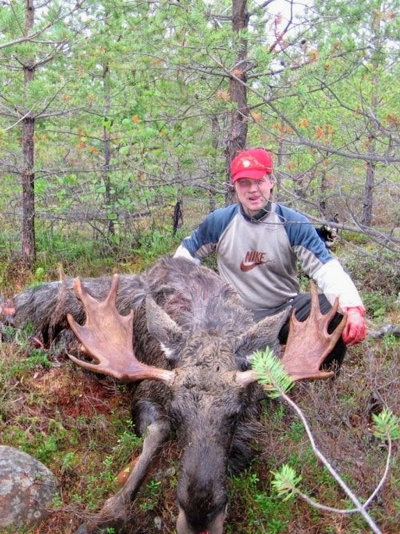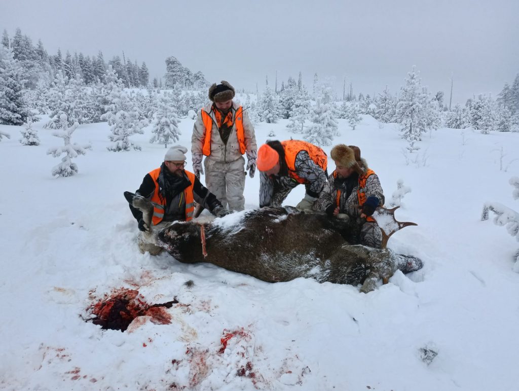HH Nukka FI Mva/FI Kva, vuorokauden ja 70km työskentelyyn kaatunut hirvilehmä Suoltilla Karhuojan latvassa. Heikki ja Hannu suolistamassa.
