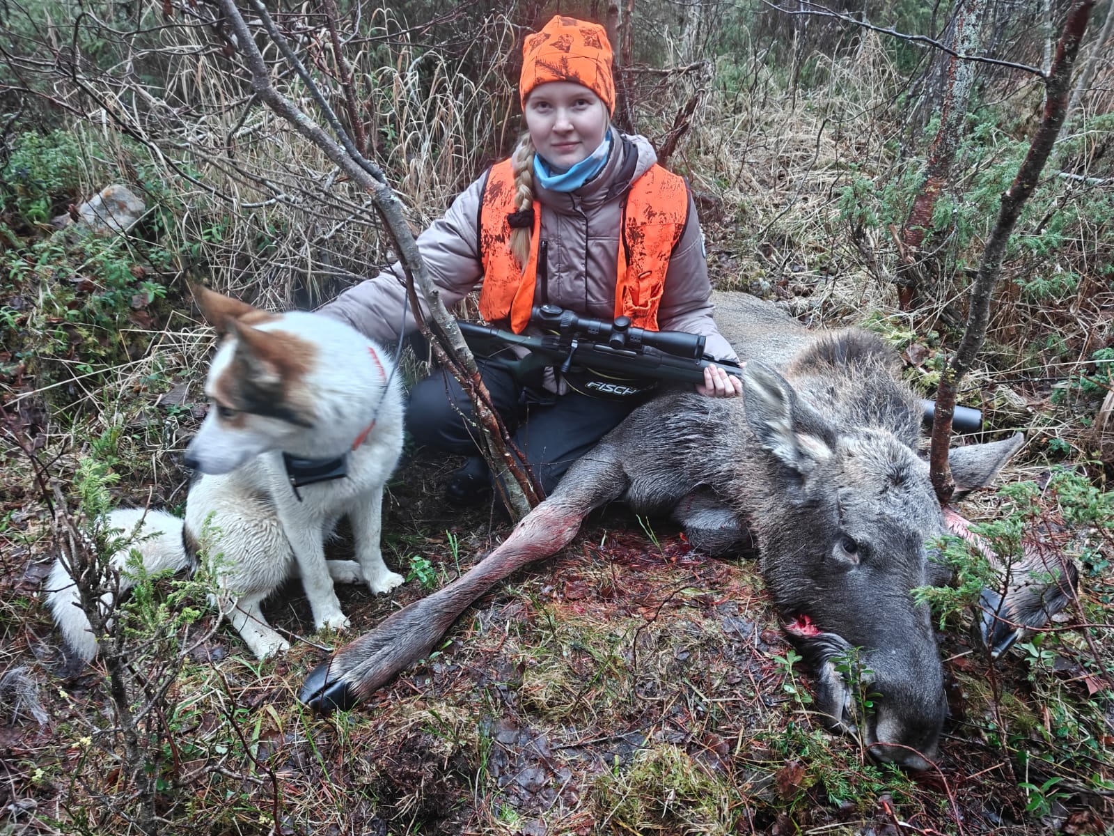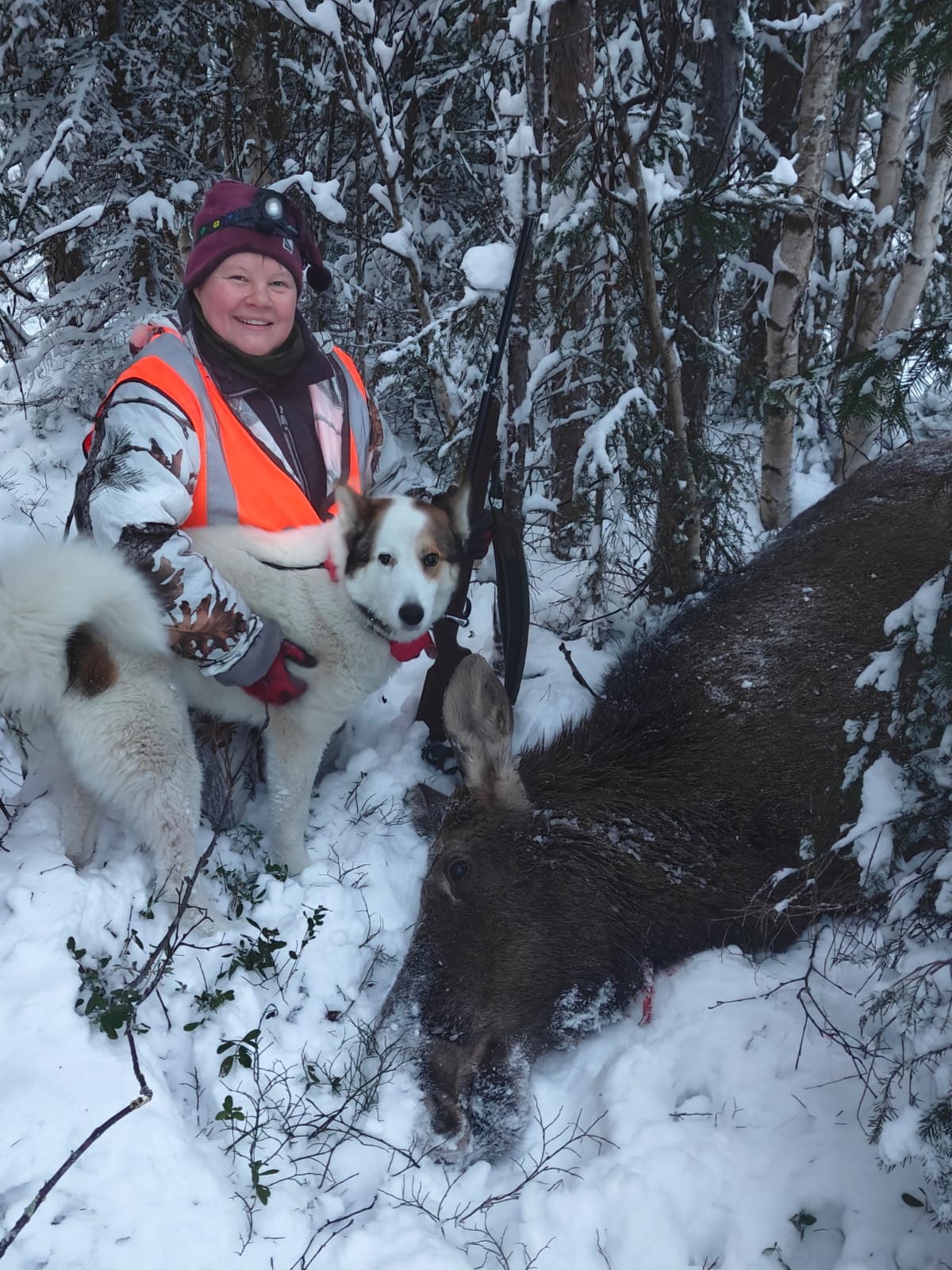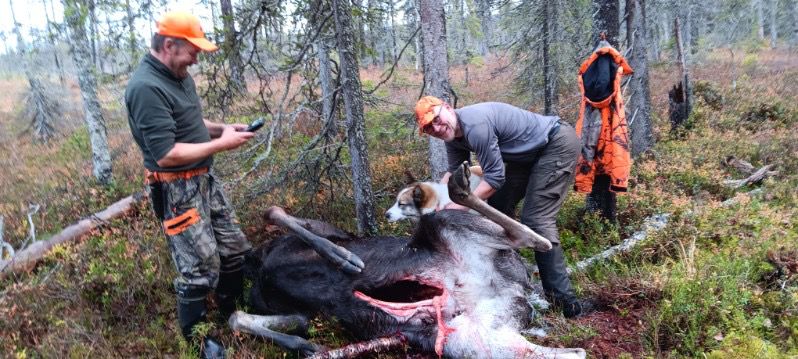 Syksyn 2025 satoa HH Nukka FI Mva/FI Kva, vuorokauden ja 70km työskentelyyn kaatunut hirvilehmä Suoltilla Karhuojan latvassa. Heikki ja Hannu suolistamassa. Nukka kaadolla